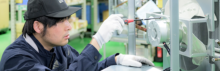 製品シリーズ・型式によって異なる仕様のコンデンサ、コンプレッサ、蒸発器、熱交換器などの主要ユニット部品を組み付ける。