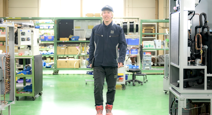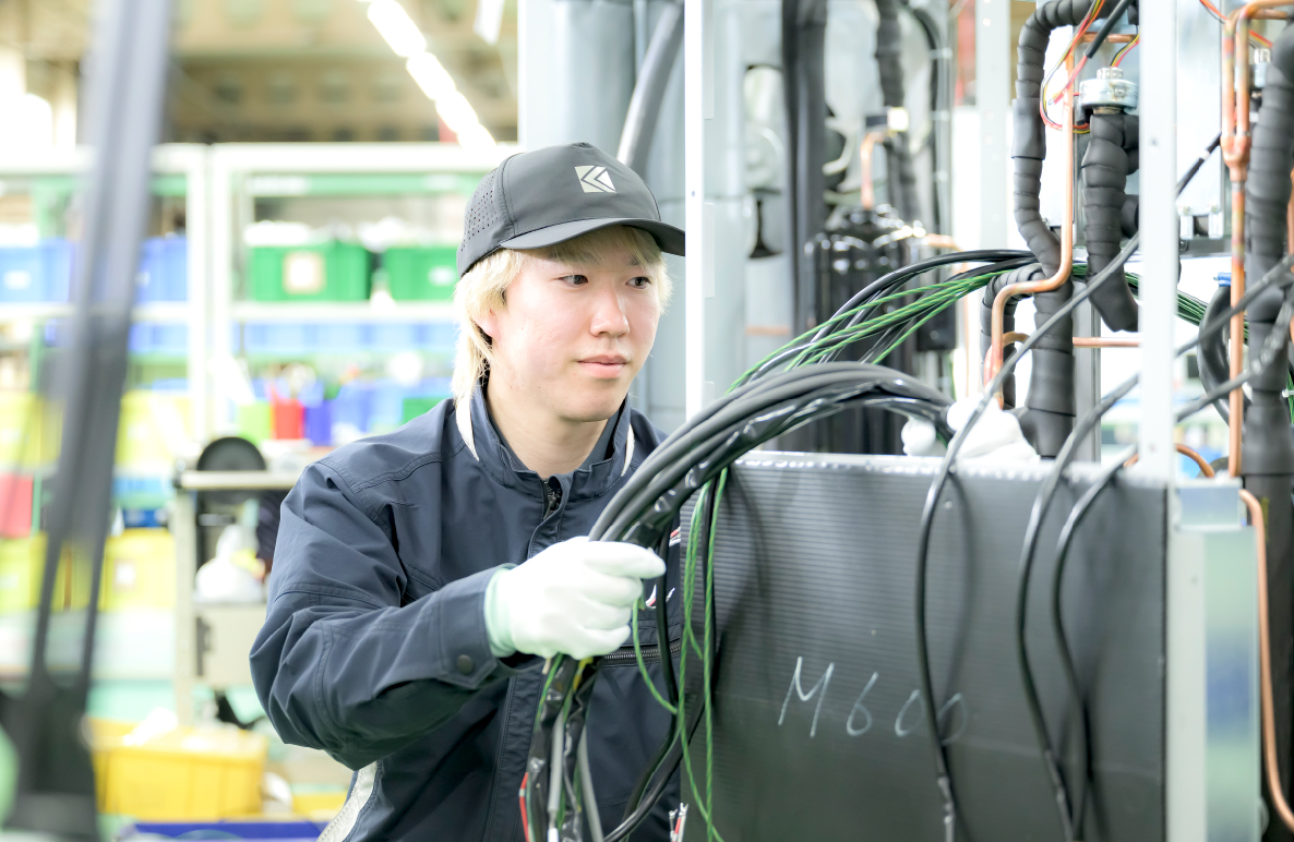 製造1グループでは主に工作機械に付帯する液温自動調整機(オイルマチック)の製造組立を行っています。工程には冷媒回路や液回路におけるろう付けや配管組立、装置の電装作業等があり、私はその中で電装作業を担当しています。具体的には、電線に端子やコネクタにピンをつける「圧着」や信号線・動力線を機器内に効率よく配置する「引き回し」、配線図通り電線を機器に接続する「配線」があります。